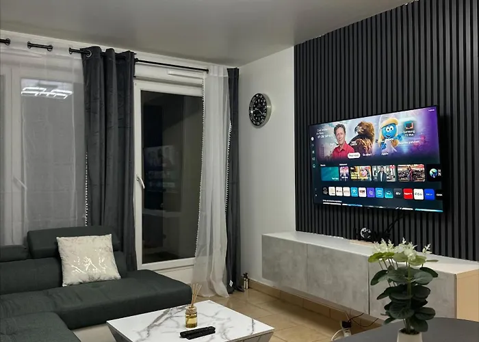 Self-catering facilities include an equipped kitchenette. Luxury Place A 5 Min De Disney apartment is 100 metres from Centre Hospitalier bus stop and a short way from Val d'Europe train station.